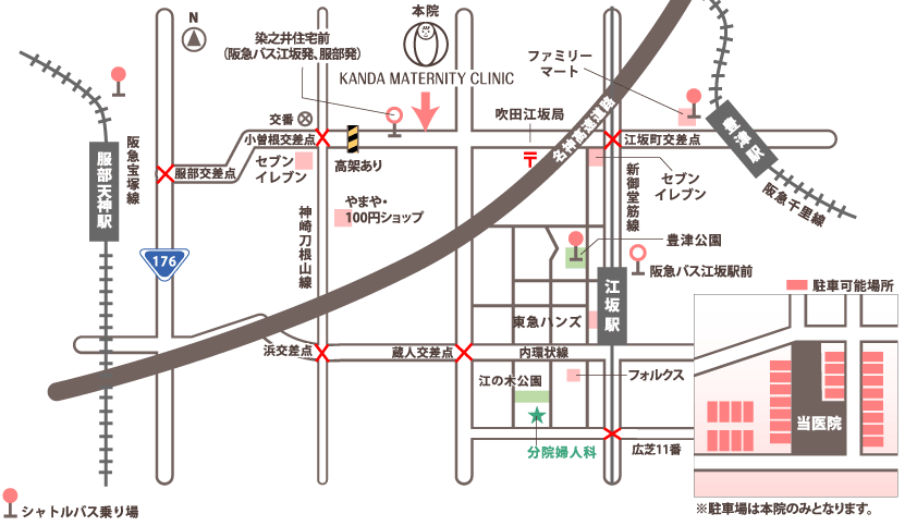 アクセス・シャトルバス|神田マタニティクリニック 大阪府吹田市産婦人科 自然分娩、安全な出産がモットーです。江坂駅からアクセス便利です。